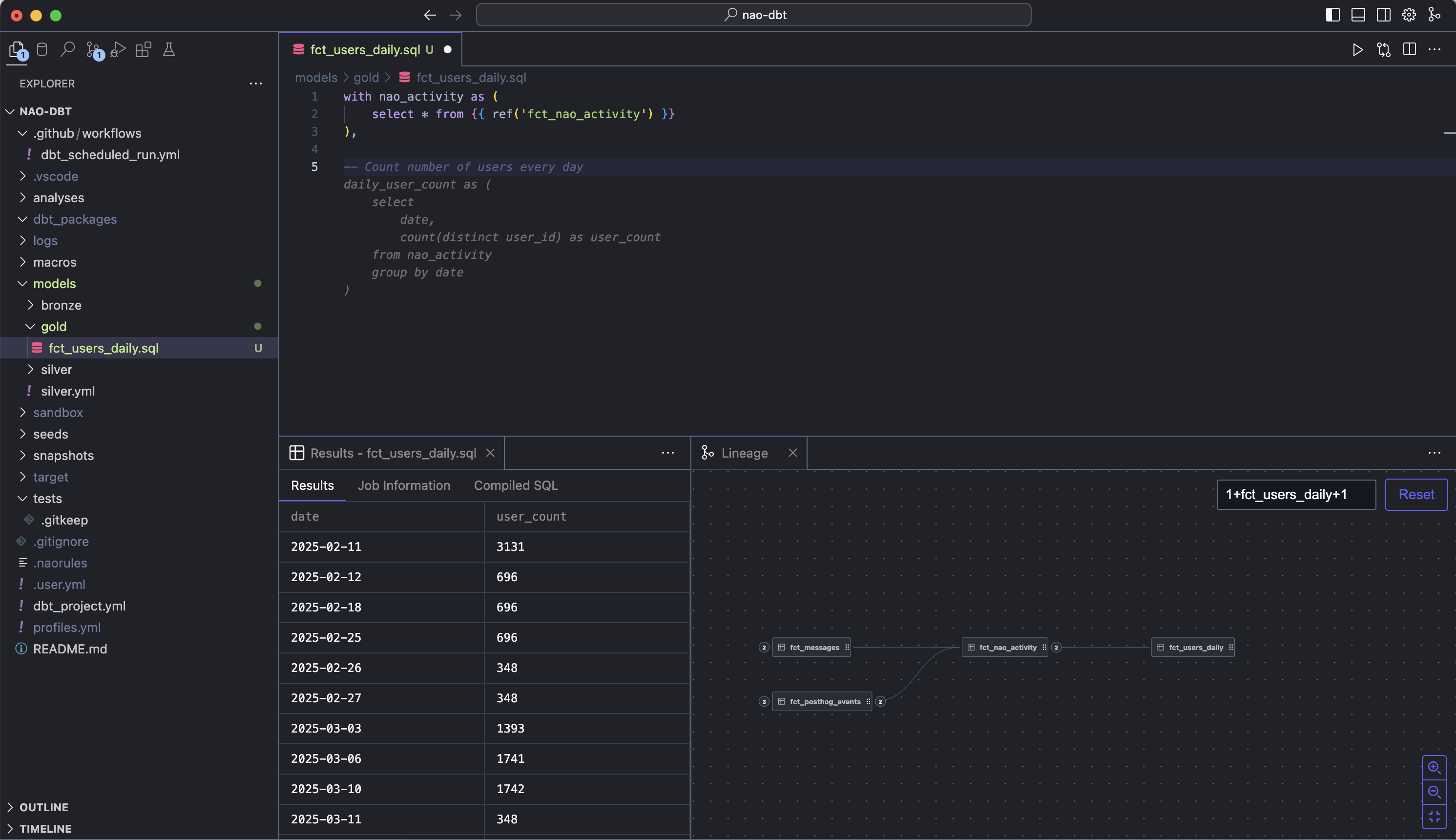 nao AI agent understands your dbt project — models, sources, docs, tests, column-level lineage. You can preview models directly in the IDE and get smart autocomplete for model columns.